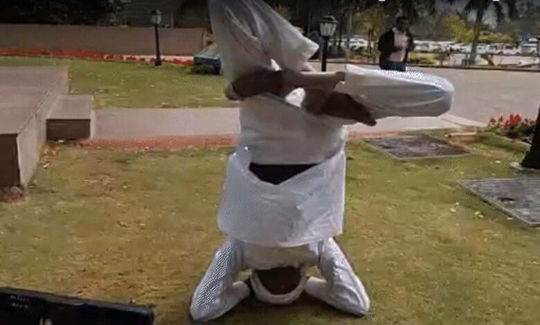 अपने बयानों और अनोखे अंदाज के लिए चर्चा में रहने वाले श्योपुर विधायक बाबूलाल जंडेल ने आज मध्य प्रदेश विधानसभा परिसर में हलचल मचा दी. खुद पर हुई पुलिसिया कार्रवाई को राजनीति से प्रेरित बताते हुए जंडेल ने गांधी प्रतिमा के सामने शीर्षासन कर अपना विरोध दर्ज कराया.