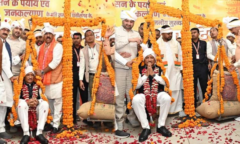 मुख्यमंत्री को धान से तौलकर प्रदेश के अन्नदाताओं ने जताया आभार