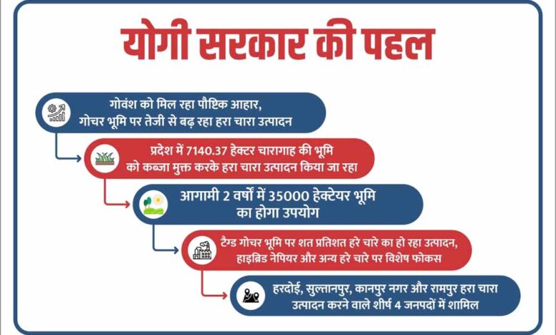 योगी सरकार ने भविष्य की जरूरतों को ध्यान में रखते हुए एक बड़ा लक्ष्य तय किया है। आने वाले दो वर्षों में 35000 हेक्टेयर कब्जामुक्त एवं सिंचित चारागाह भूमि पर हरा चारा उत्पादन कराया जाएगा। इसके लिए योजनाबद्ध तरीके से कार्य किया जा रहा है। पशुपालन विभाग के प्रमुख सचिव मुकेश मेश्राम ने बताया कि प्रदेश में 1691.78 हेक्टेयर क्षेत्र में हाइब्रिड नेपियर चारा और 5448.59 हेक्टेयर में अन्य हरे चारे (जई, बरसीम आदि) की बुआई की जा चुकी है। इससे गोवंश को सालभर पौष्टिक और संतुलित आहार उपलब्ध हो सकेगा।