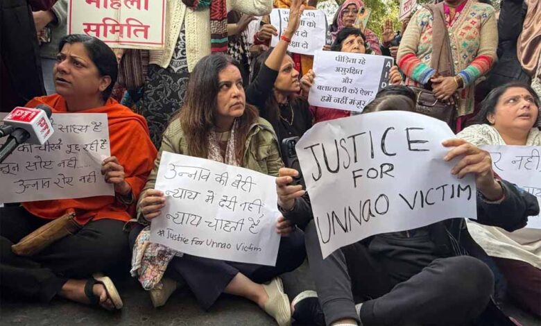 उन्नाव रेप केस: कुलदीप सेंगर की जमानत के खिलाफ दिल्ली हाईकोर्ट के बाहर महिलाओं का जोरदार प्रदर्शन