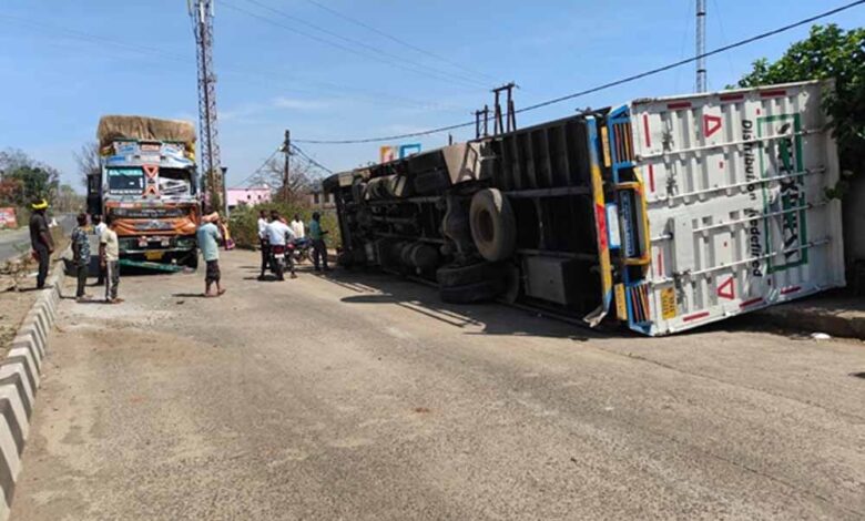 इधर… एनएच 30 पर कंटेनर पलटा, पीछे से आ रहा ट्रक भी टकराया